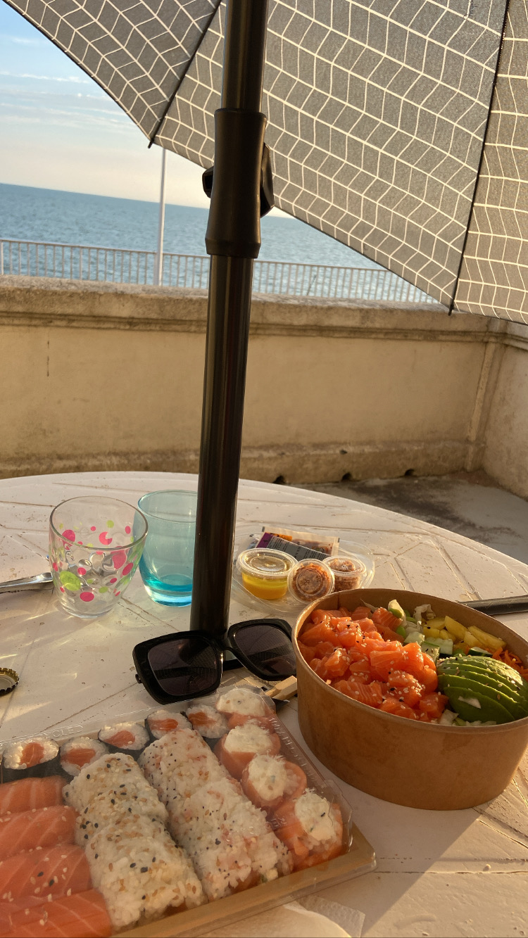 Jeudi soir pour notre dernière soirée à Royan nous avons commander en emporter. Tous les plats étaient succulents, les brochettes de saumon/boulettes ainsi les sushis étaient un régal.